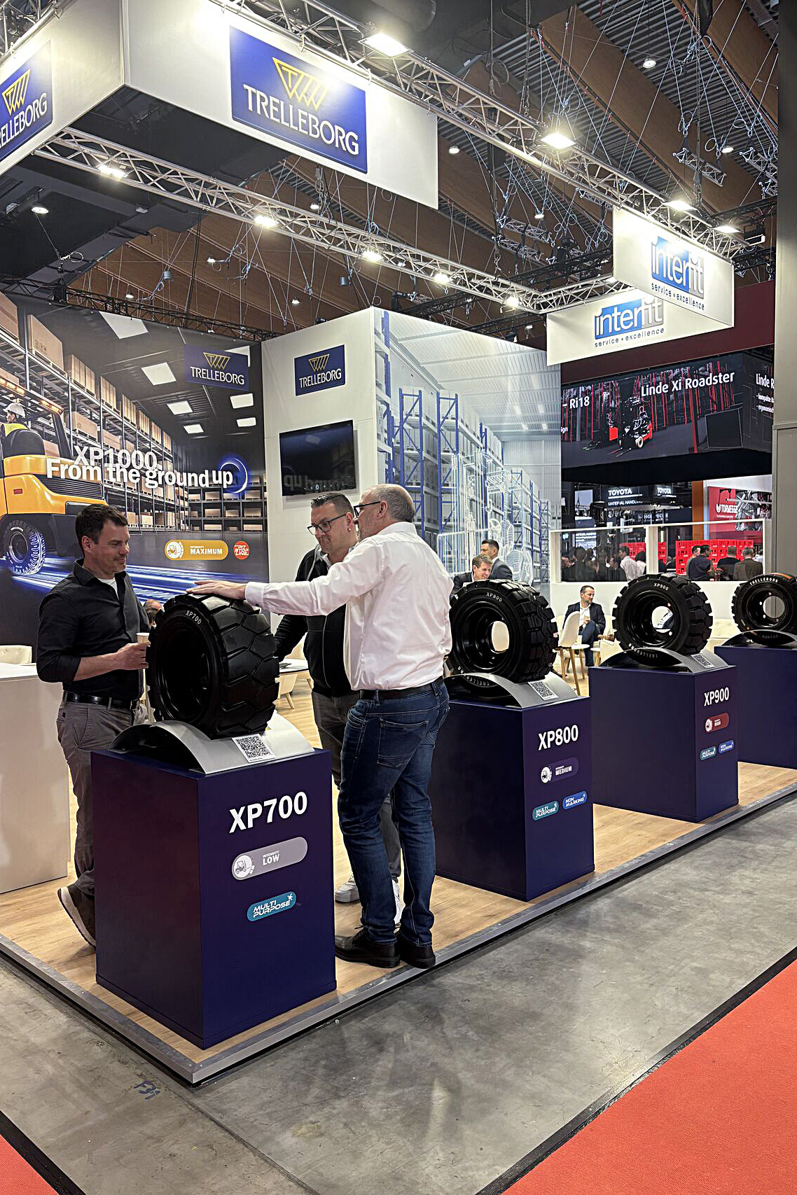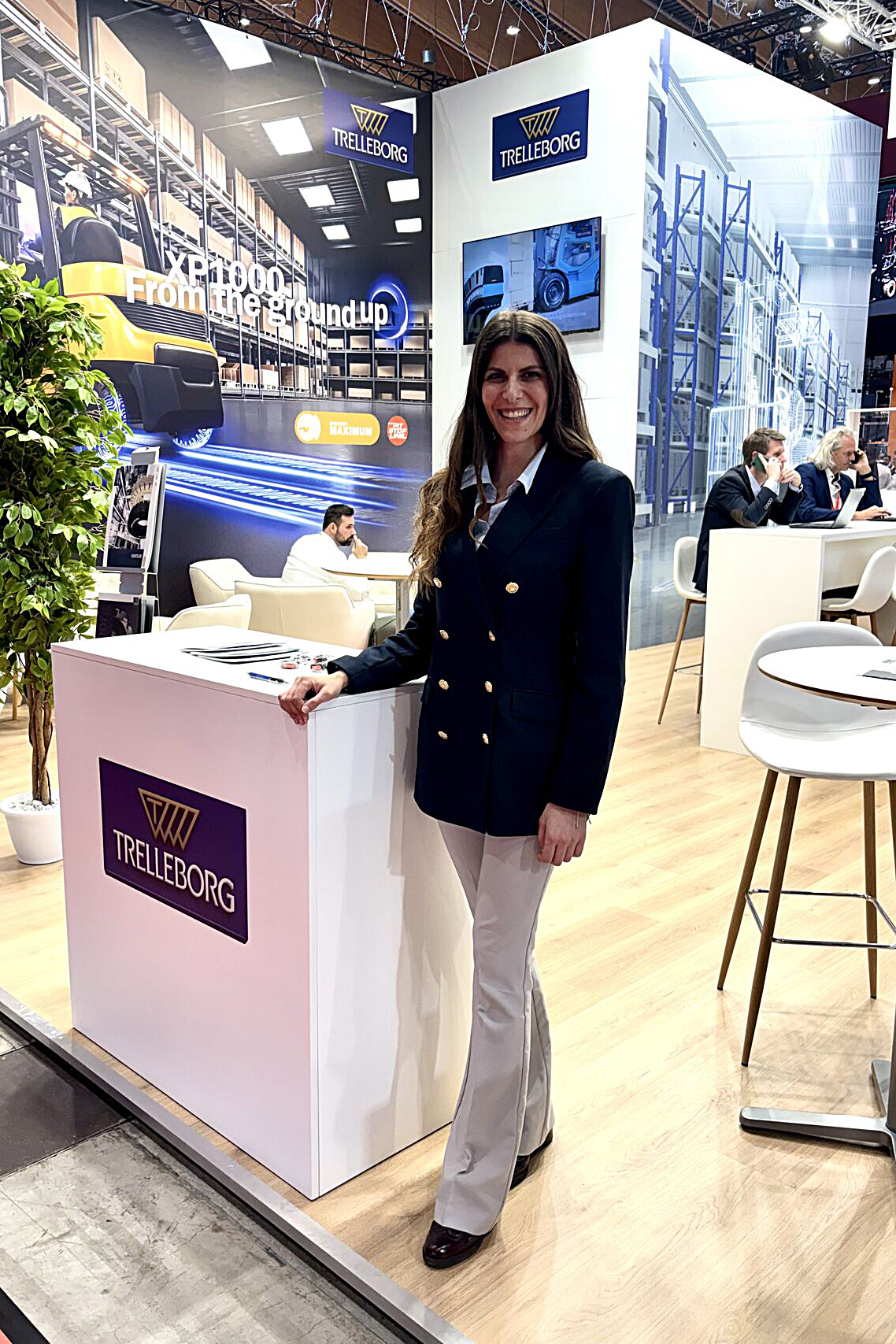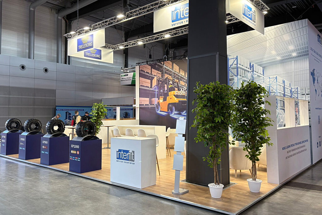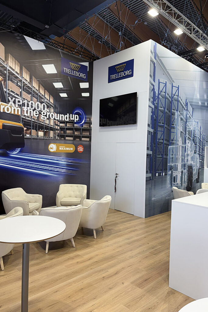 At Logimat 2026, we built a stand for Yokohama TWS exhibitors designed to be both easy to read remotely and friendly for face-to-face meetings. The open peninsula stand stood on a wood-look floor and was dominated by large-scale graphic walls with an industrial motif, complemented by a central technical core with an integrated screen. A truss structure with lighting and prominent branding was suspended above the space to help visitors quickly find the stand in the hall.