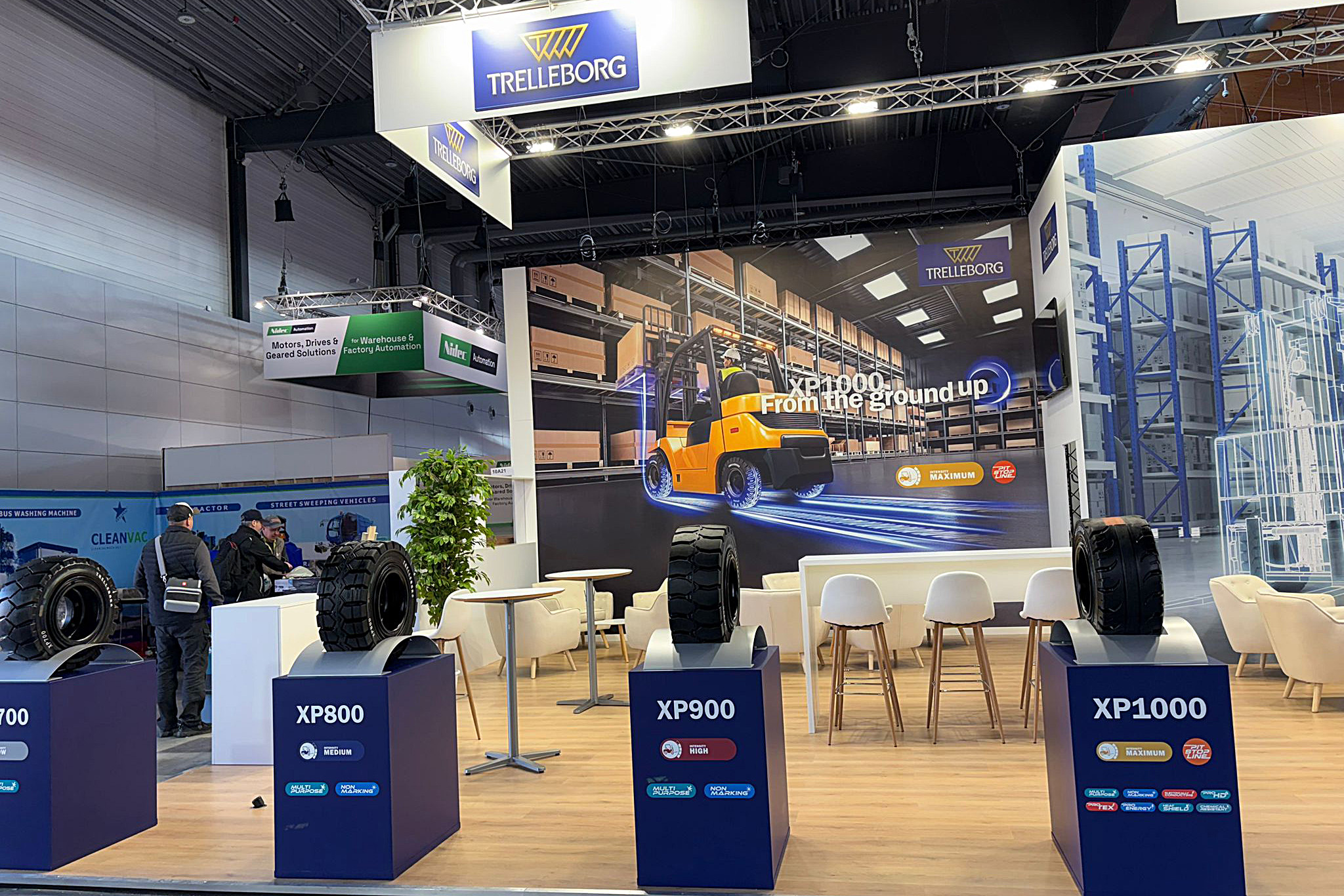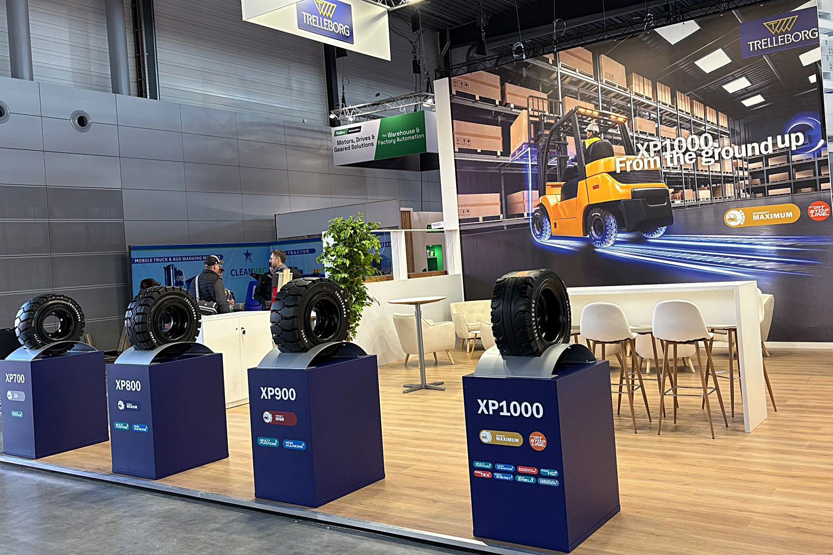 The main product area was designed as a series of separate platforms with clear descriptions of each model, so visitors could compare products comfortably while moving smoothly around the stand. The meeting area consisted of tables and bar seating at the back, complemented by greenery that visually softened the space and separated it from the hustle and bustle of the aisles. The result was an exhibit that combined a strong visual impact with practical operation throughout the event.