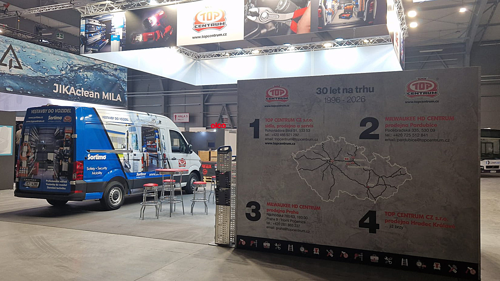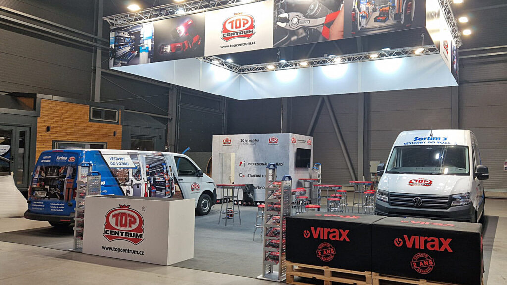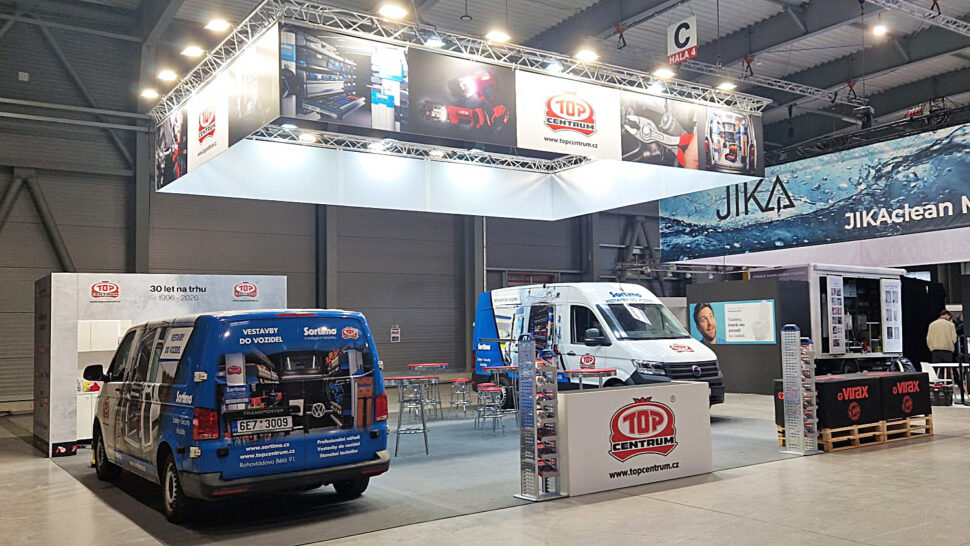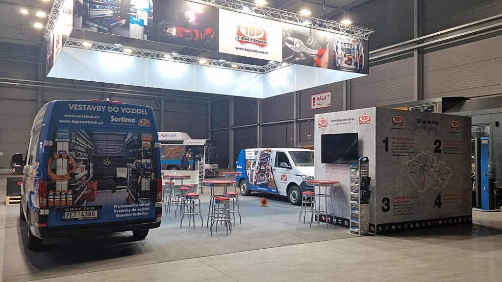 At Aquatherm 2026, we have prepared an exhibition for Topcentrum exhibitors based on maximum visibility and clear visitor orientation. The dominant feature of the stand was a suspended aluminium truss structure with large graphics around the perimeter, which carried the main visuals and Topcentrum logo and could be seen from a distance. The open floor plan let the exhibits stand out, while the reception desk and clear seating areas naturally led visitors to stay on the stand.